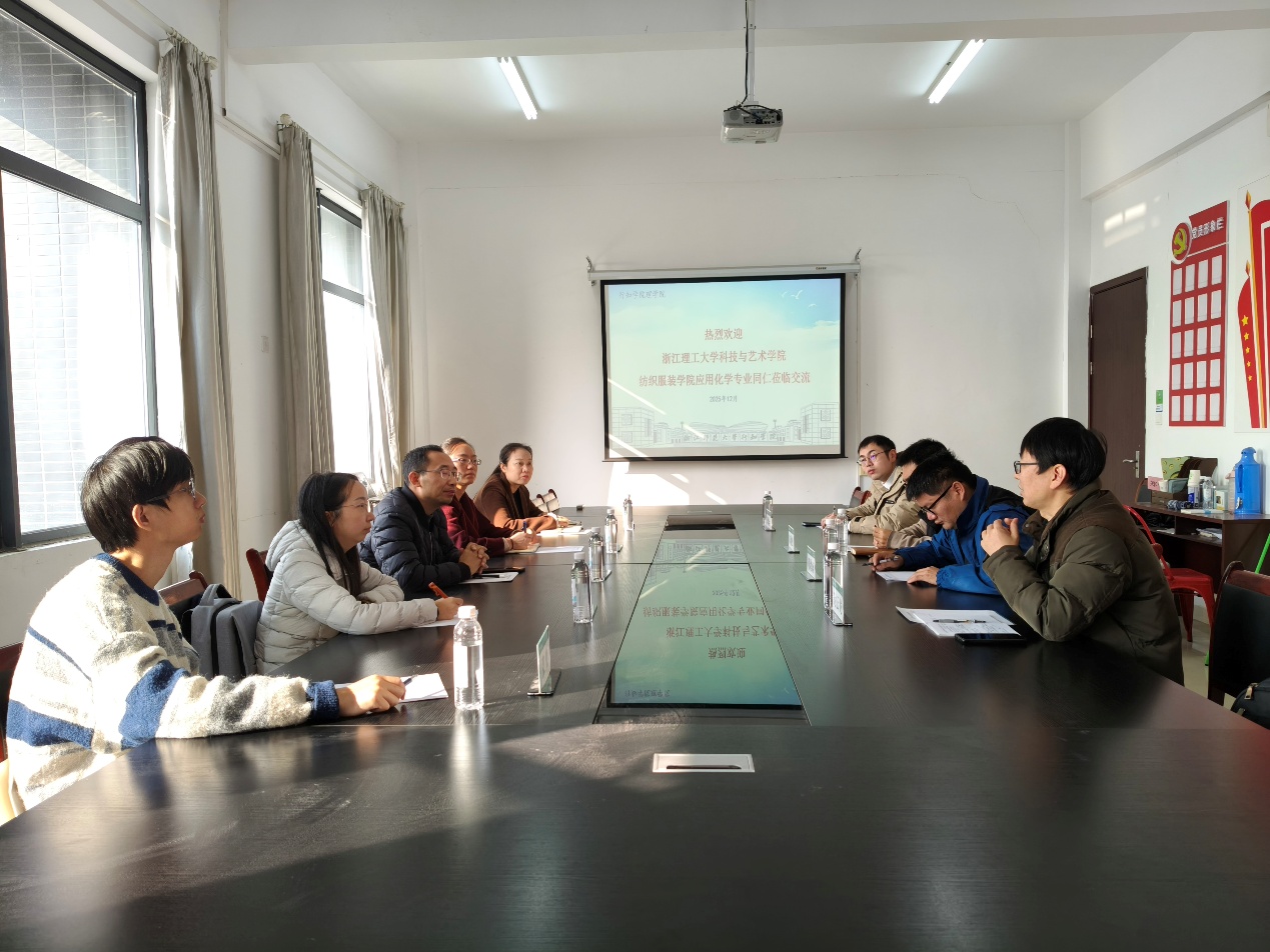 2025年12月8日,浙江理工大学科技与艺术学院纺织服装学院应用化学专业负责人单兴刚、实验室主任张翠红、专任教师陈静、张良以及实验员陈淑君老师一行赴我院学院开展专题学习交流。理学院书记胡鸿雨、副院长陈寒松、应用化学专业主任谢云龙及专任教师韩熠垚共同参与座谈,双方围绕应用型人才培养模式创新、课程体系改革、实践教学建设等核心议题展开深入研讨。