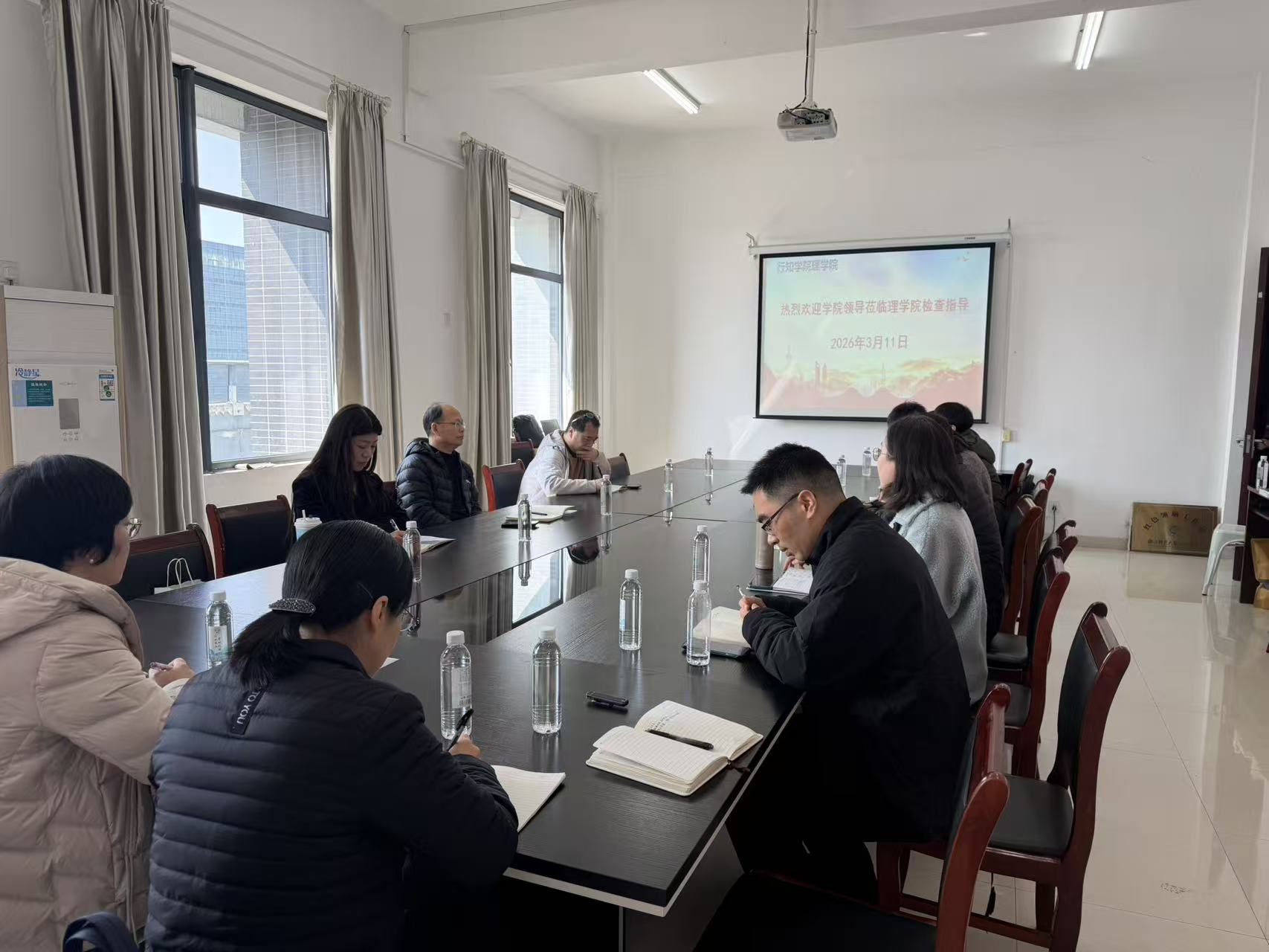 3月11日上午,行知学院副院长郑荣泉一行深入理学院开展春季学期开学检查,听取学院工作汇报,并就新学期重点工作进行指导。理学院领导班子及各专业主任参加检查活动。